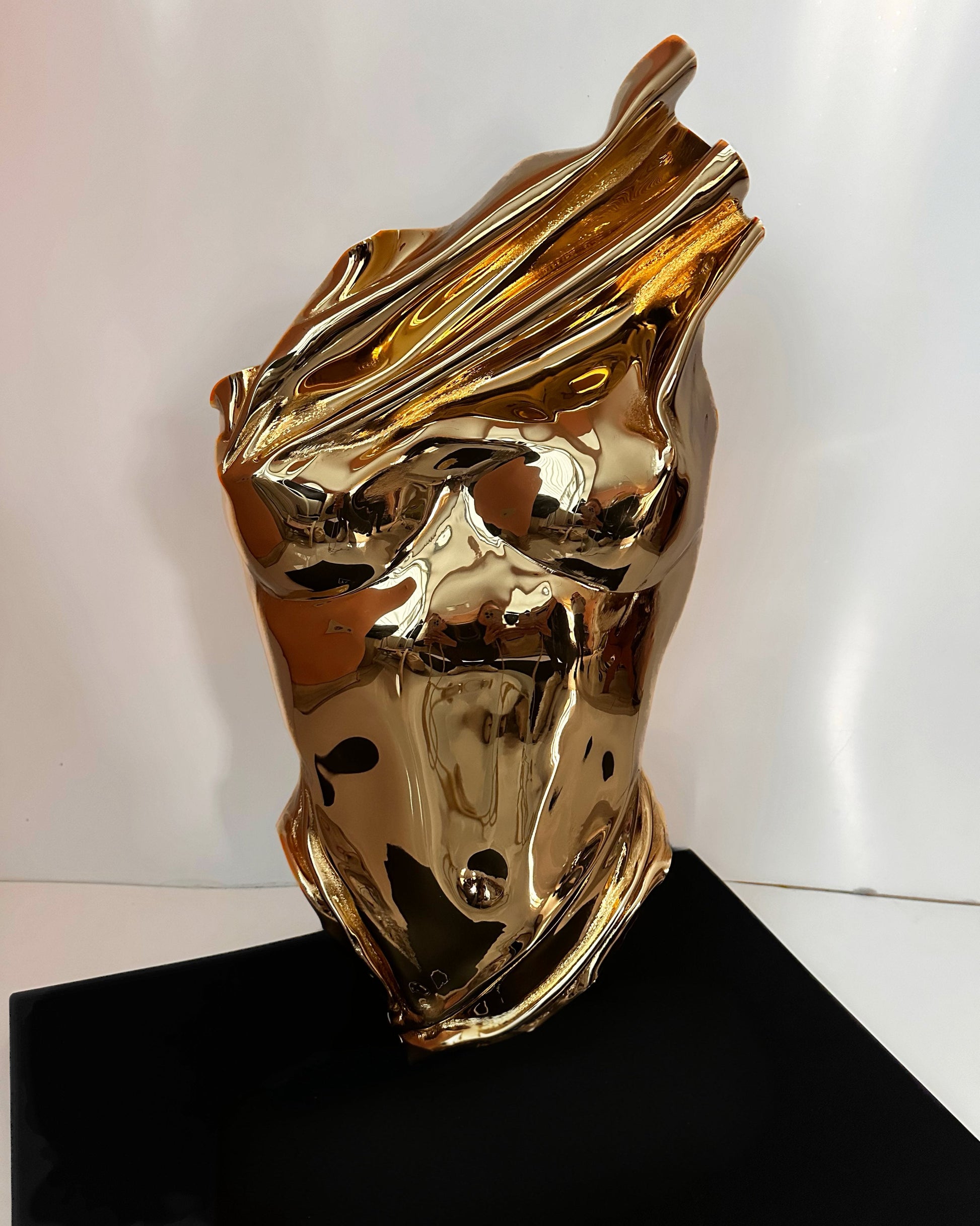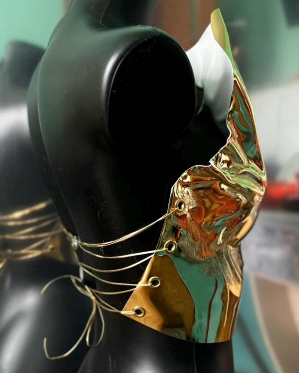 Shine with confidence - this gold acrylic corset is made to turn heads. The glossy wet-look surface with a melted metal effect highlights your figure and makes your outfit unforgettable, whether for a photoshoot, red carpet event, or late-night party. The strapless design adds daring charm, while the structured shape keeps a flawless silhouette.