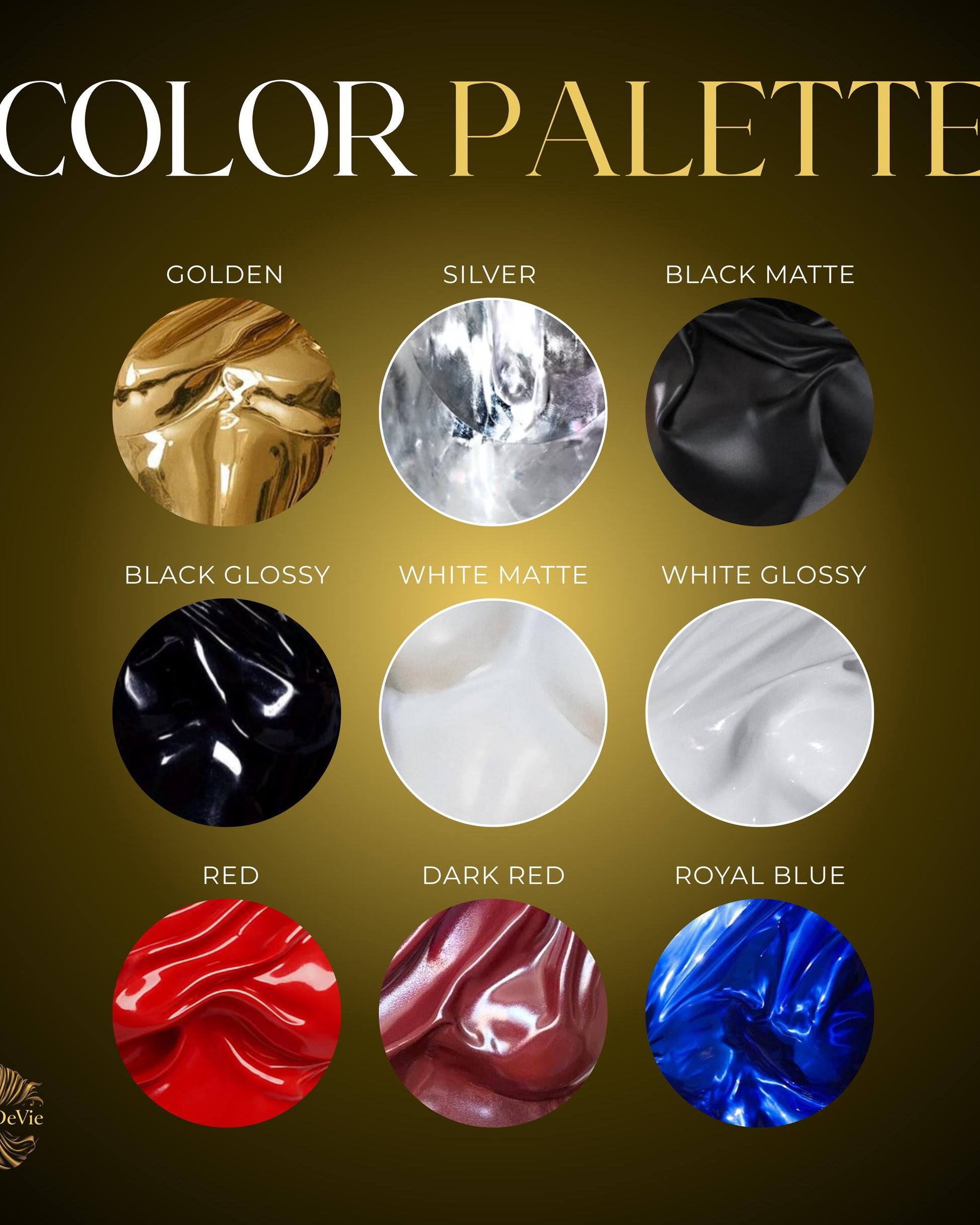 COLOUR OPTIONS: golden, silver, black matte, black glossy, white matte, white glossy, red, dark red (burgundy), royal blue