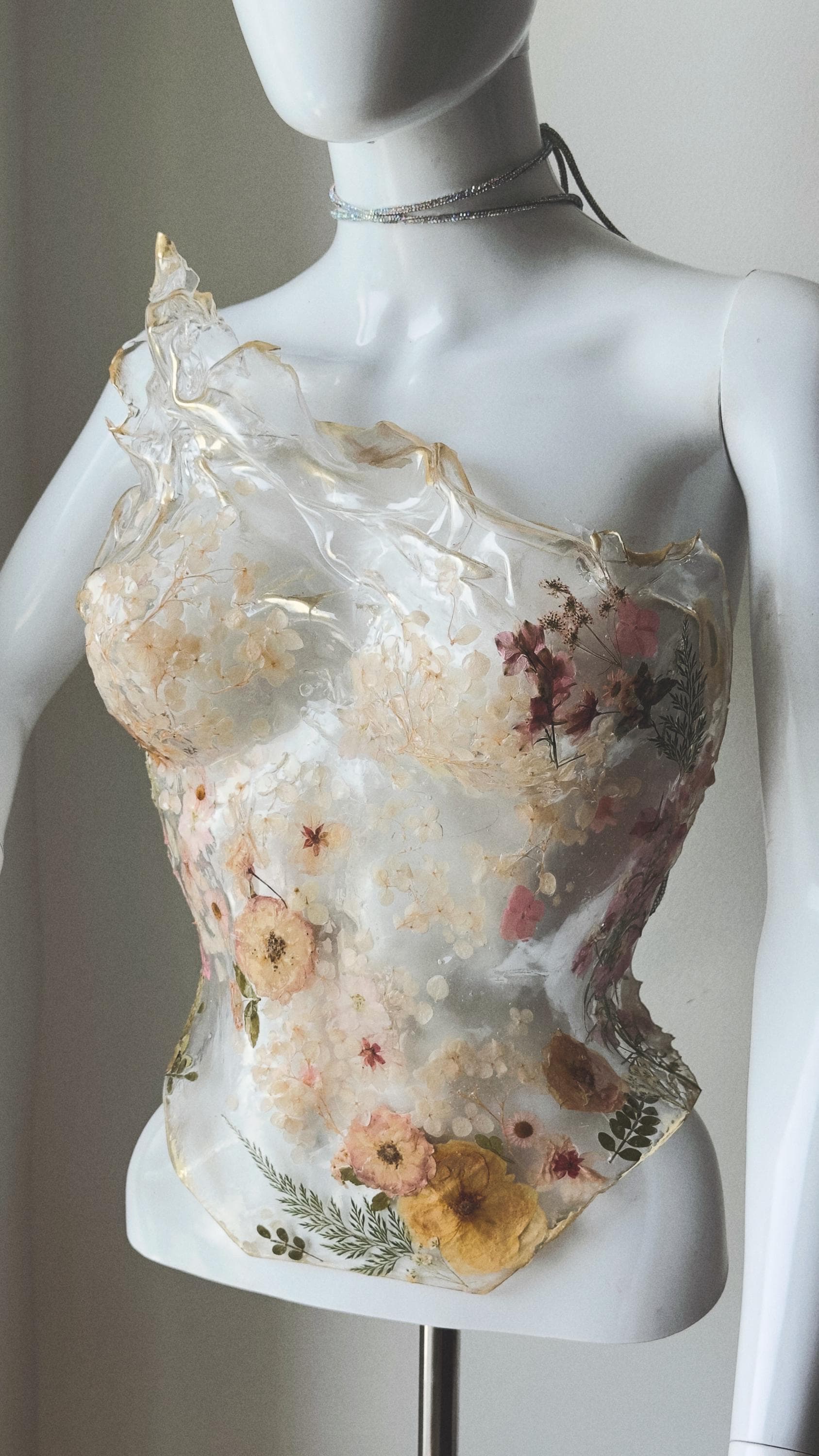 Transparent acrylic corset with delicate dried flowers brings a soft, romantic charm to any bridal or special occasion outfit. Perfect for photoshoots, wedding events, or elegant evenings, it adds a whimsical and dreamy touch to your look. Lightweight, comfortable, and artistic, this bustier top is a standout piece for brides, fashion lovers, or anyone seeking a unique statement garment. Makes a thoughtful and stylish gift for weddings, anniversaries, or creative fashion enthusiasts.