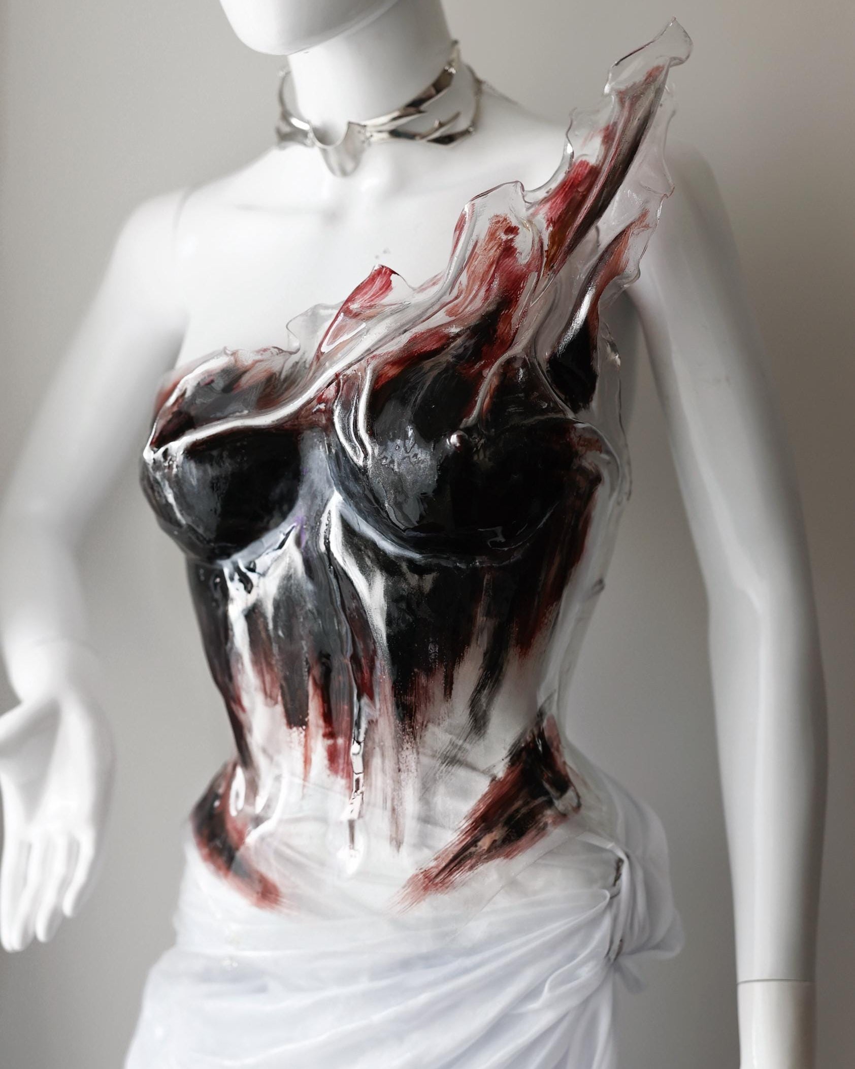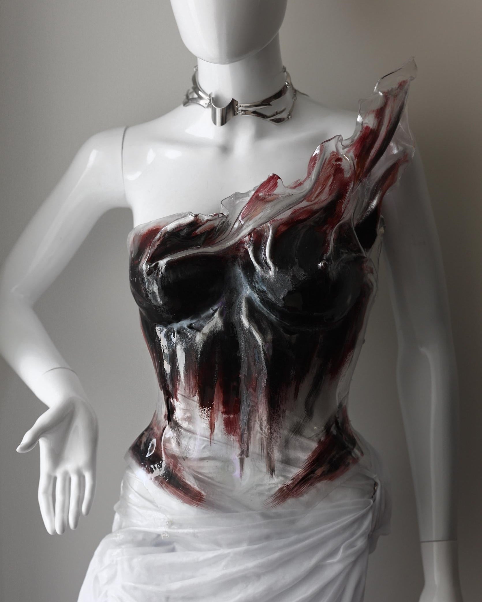 Our custom-made corset made from moulded acrylic plastic. Each corset can be slightly different. Futuristic breastplate made for art festivals, stage performance, go go dancers and avantgarde looks. If combines with a white shirt or black dress - can be worn to any occasion any season. Each piece is unique.