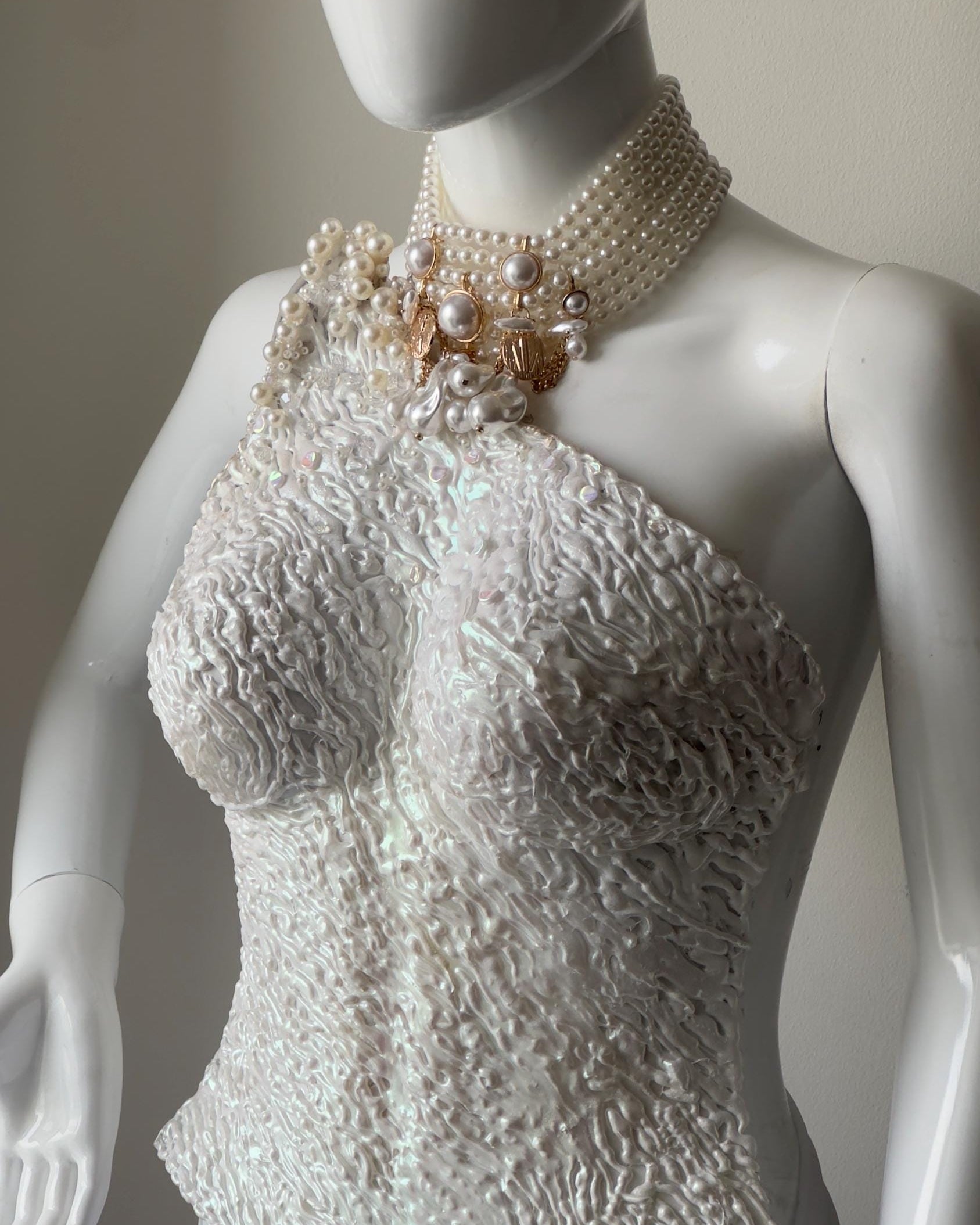 White armor corset bridal breastplate stage performer outfit, bustier top with pearls, mermaid outfit, shell corset.
