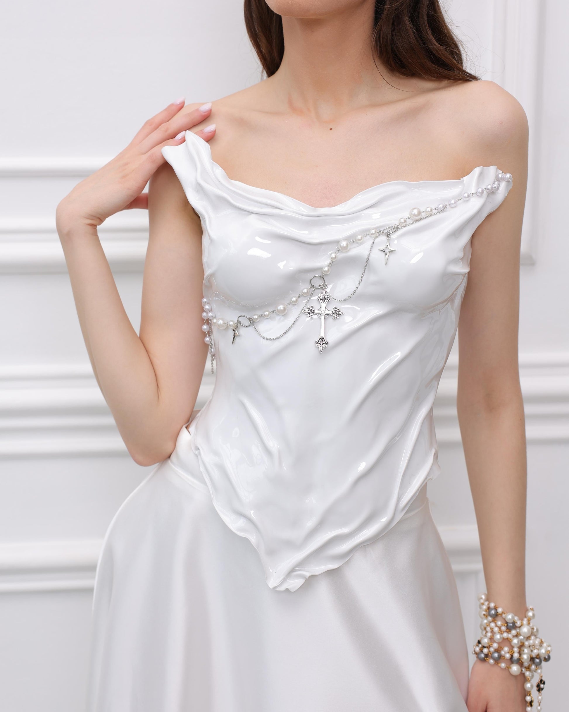 This ice goddess armor top works beautifully for photoshoots, performances, white parties, and editorial styling. Each piece is shaped by hand, so the curves and details are unique — just like wearable modern art.