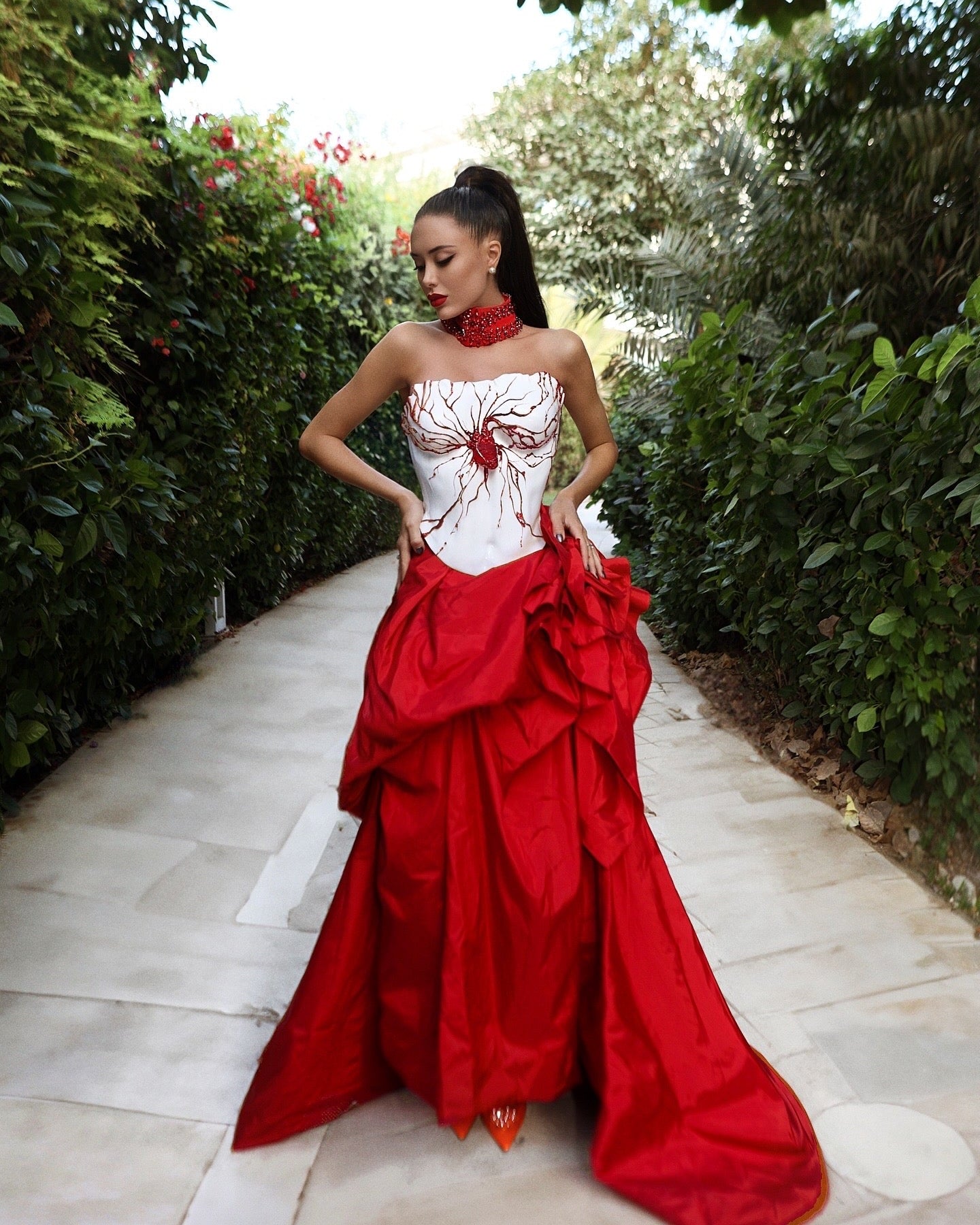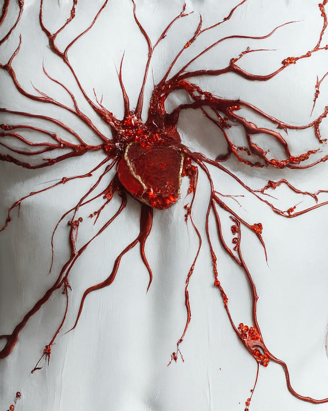 Our anatomical heart corset is a bold futuristic top created from sculpted acrylic. The white base with red vein details makes this piece perfect for performers, Valentine’s Day looks, avant-garde fashion shoots, weddings with a twist, cosplay, and New Year celebrations.