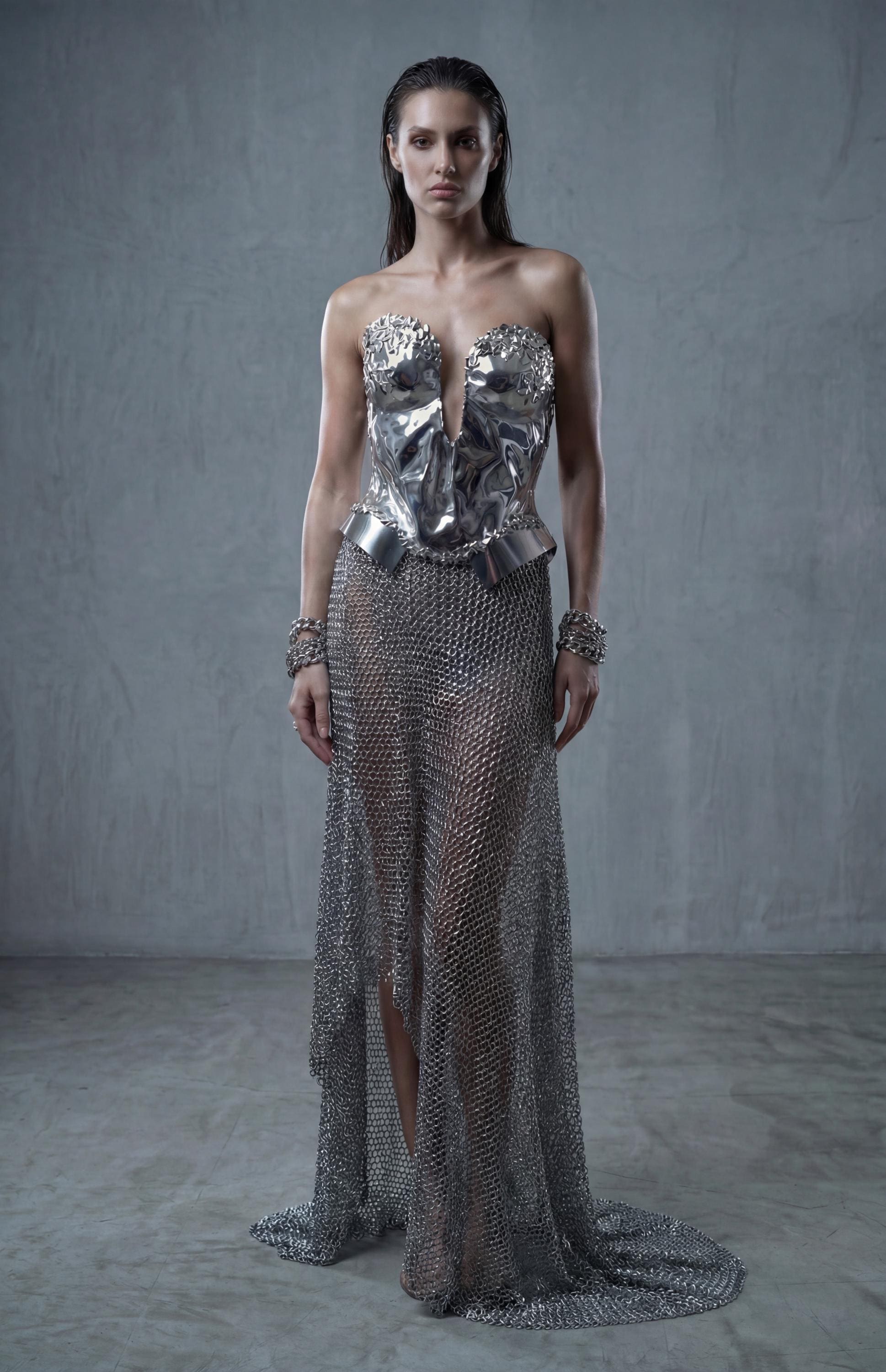 This sculptural silver armor corset is a bold futuristic statement piece inspired by cyberpunk, goddess armor, and avant-garde fashion.