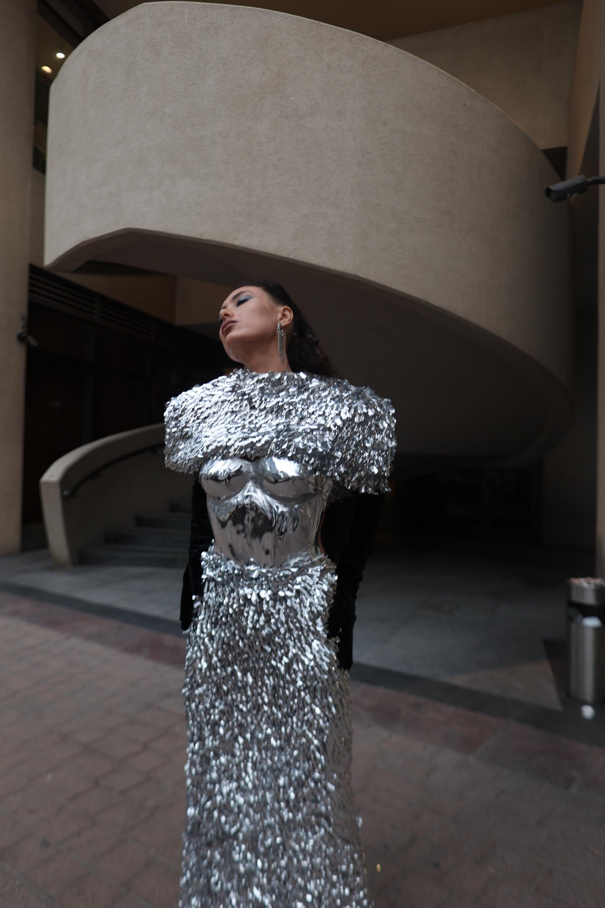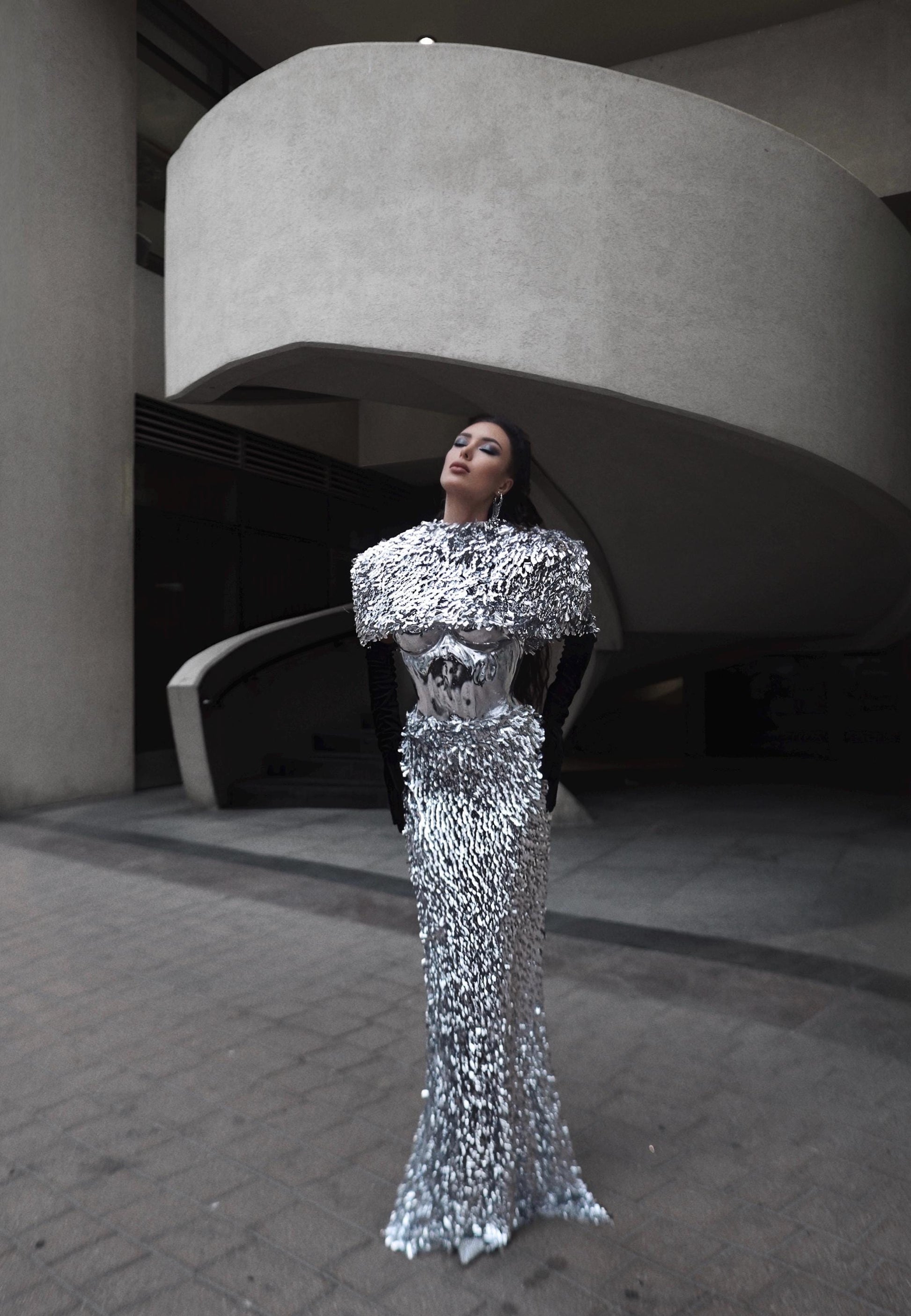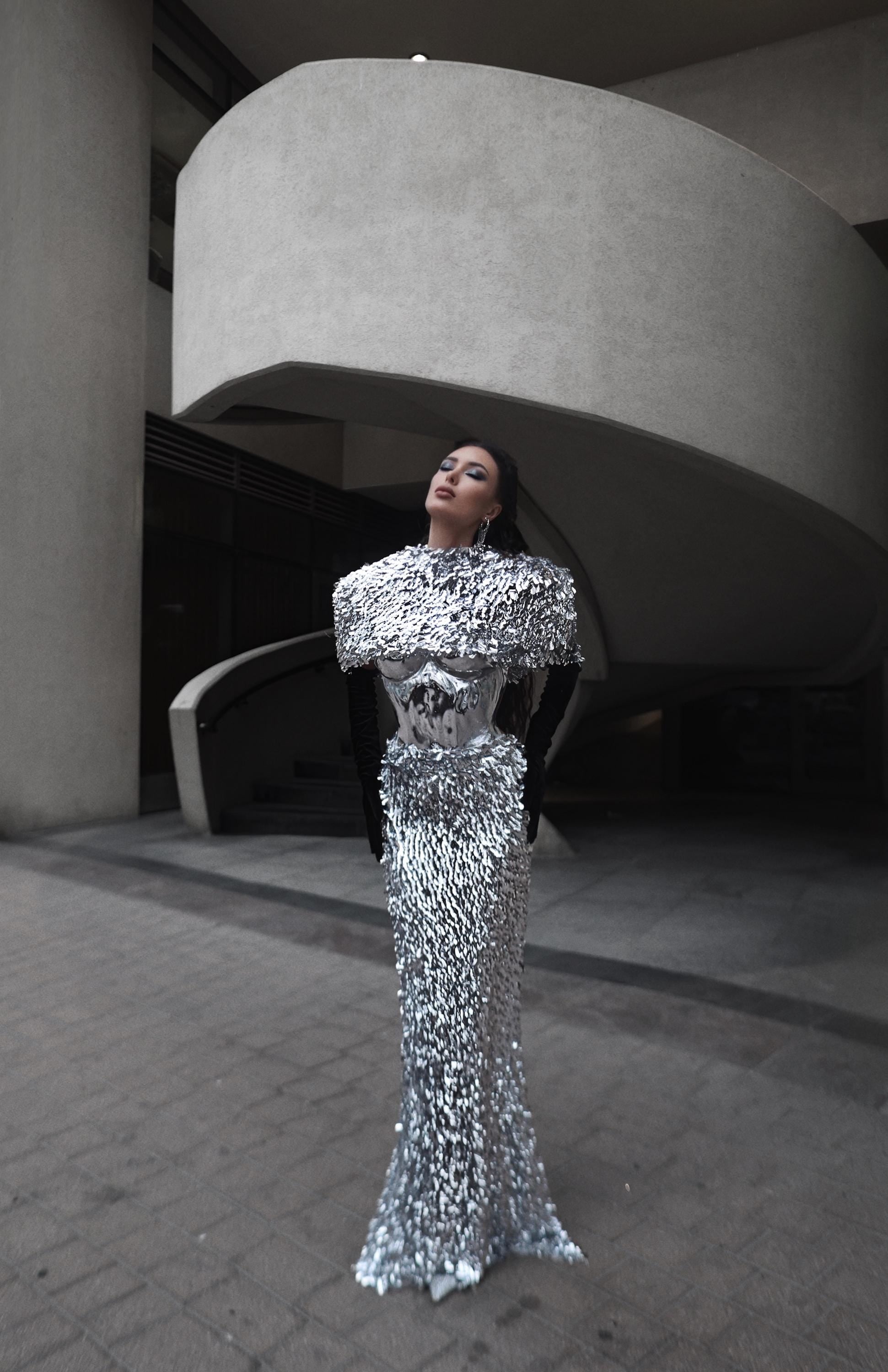 This handmade silver outfit features a dramatic shoulder cape and a shimmering skirt that catches the light with every movement. Perfect for special events, photoshoots, performances, or editorial looks.