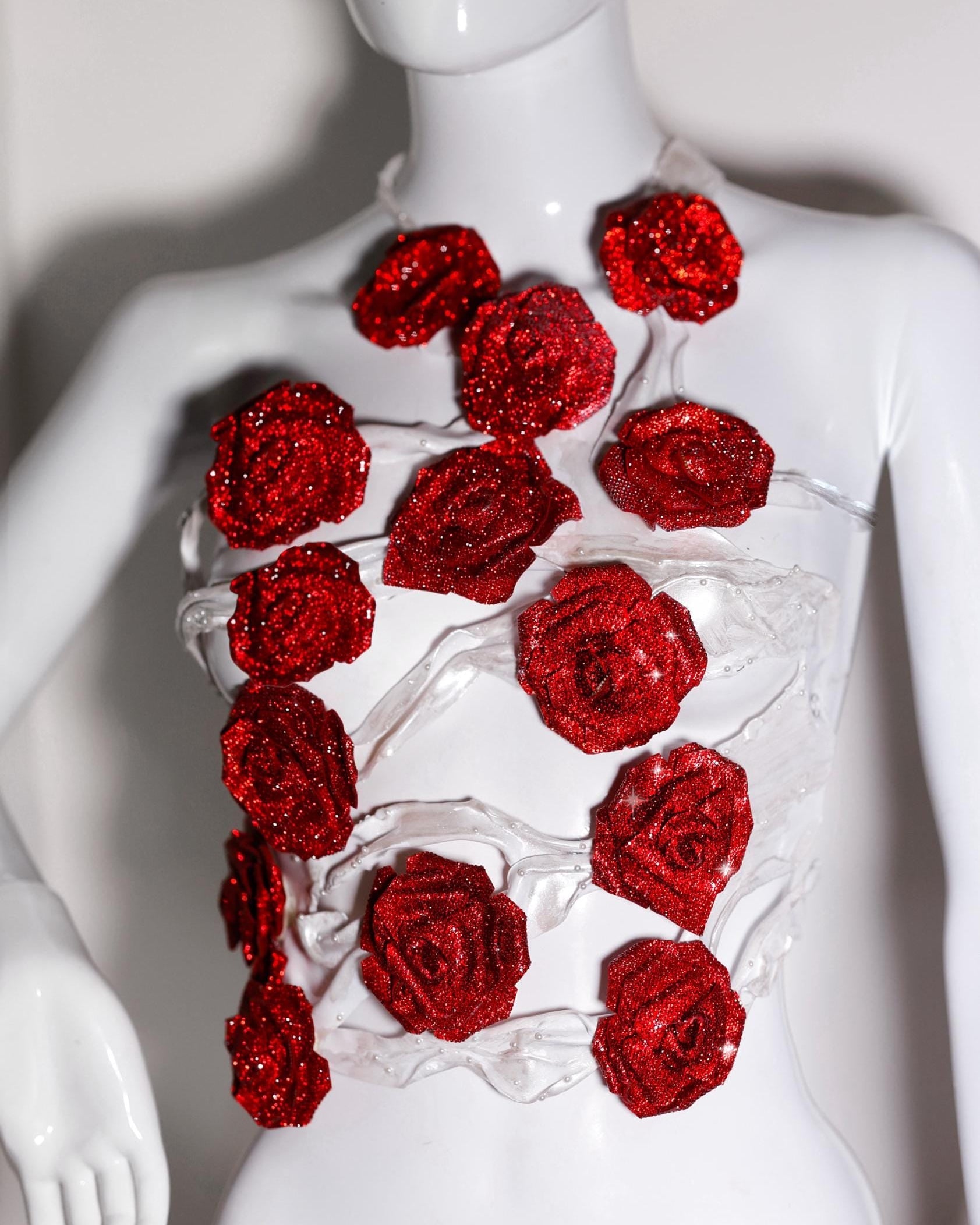White armor corset bustier top with roses, floral molded rave outfit, custom made top art Halloween festival outfit.