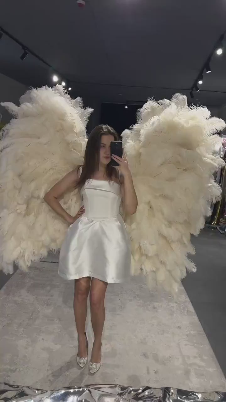 These magnificent ivory feather wings feature luxurious, fluffy feathers in a soft cream white color with incredible volume and dimension. The wings create a dramatic, ethereal effect that's perfect for photoshoots, weddings, and special events.